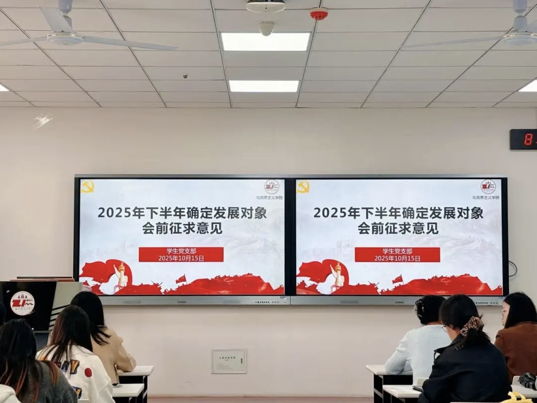 为加强支部队伍建设,严格规范党员发展程序,10月15日上午,马克思主义学院学生党支部召开2025年下半年确定发展对象会前征求意见会,对柳婉儿等13名符合发展条件的入党积极分子进行民主评议与集中讨论。会议由支部委员会委员主持,13名入党积极分子以及培养联系人、党员代表、群众代表参加此次会议。