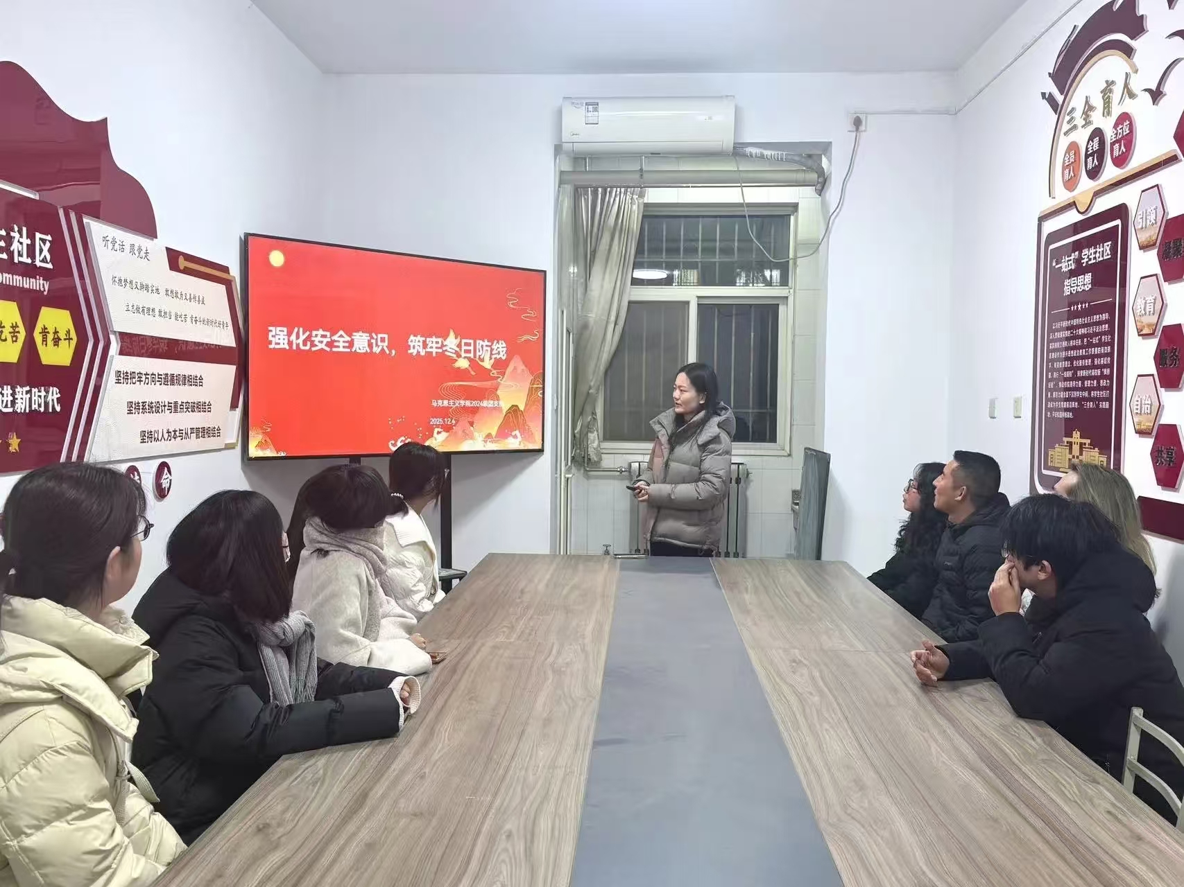 为提升我院学生的安全防范意识与自我保护能力,12月4日,马克思主义学院团支部于11号公寓“一站式”学生社区开展“强化安全意识,筑牢冬日防线”主题团日活动。本次活动由2024级团支书张睿怡主讲,全体共青团员参与。