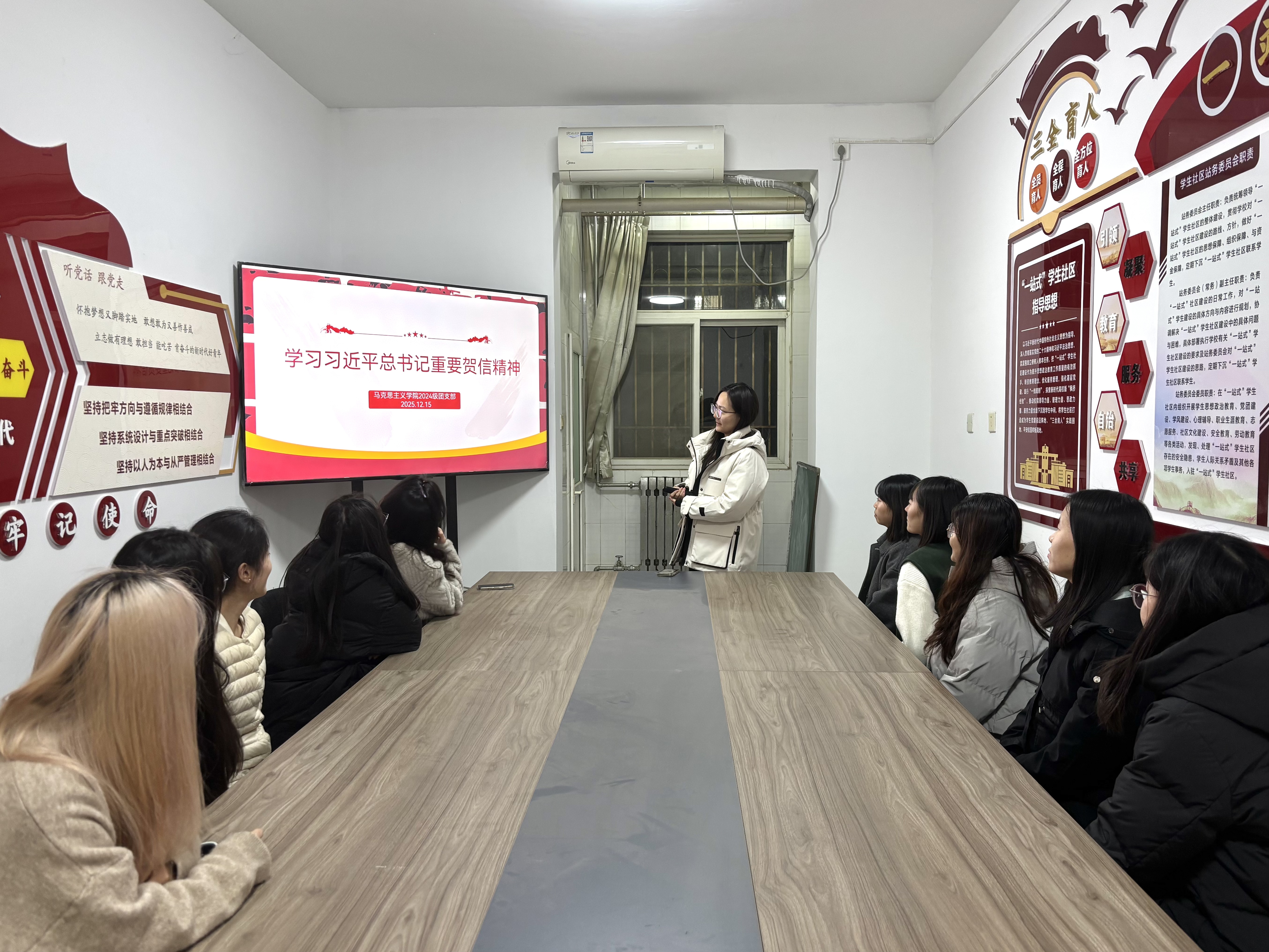 为进一步引导广大团员青年坚定理想信念、勇担时代使命,12月15日晚,马克思主义学院2024级团支部于11号公寓“一站式”学生社区开展“学习习近平总书记重要贺信精神”主题团日活动。活动由2024级团支书张睿怡主持,全体共青团员参与。