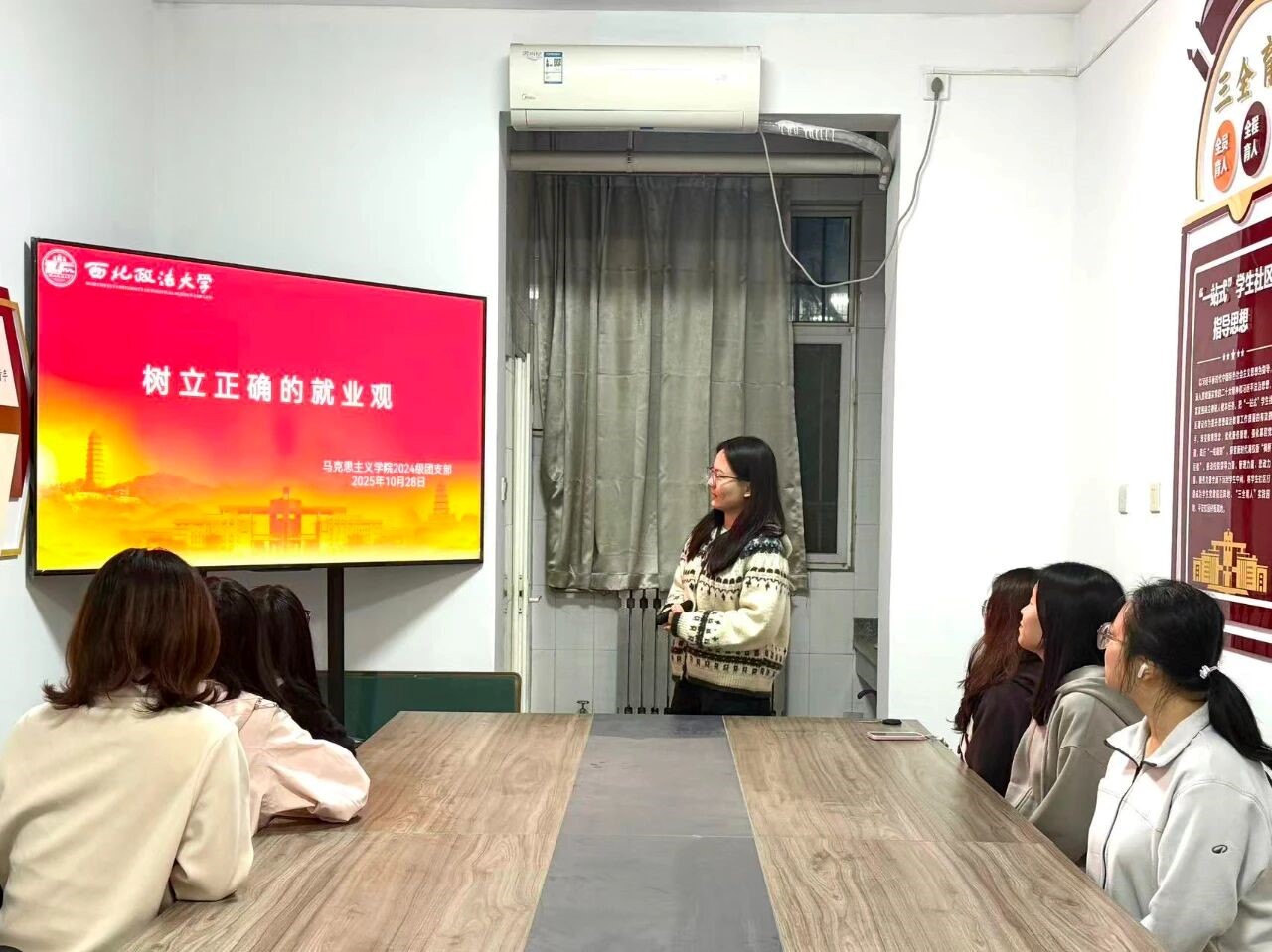 为引导广大团员认清就业形势,树立科学理性的就业观念,马克思主义学院2024级团支部于11号公寓“一站式”学生社区开展“树立正确的就业观”主题团日活动。本次活动由2024级团支书张睿怡主讲,全体共青团员参与。