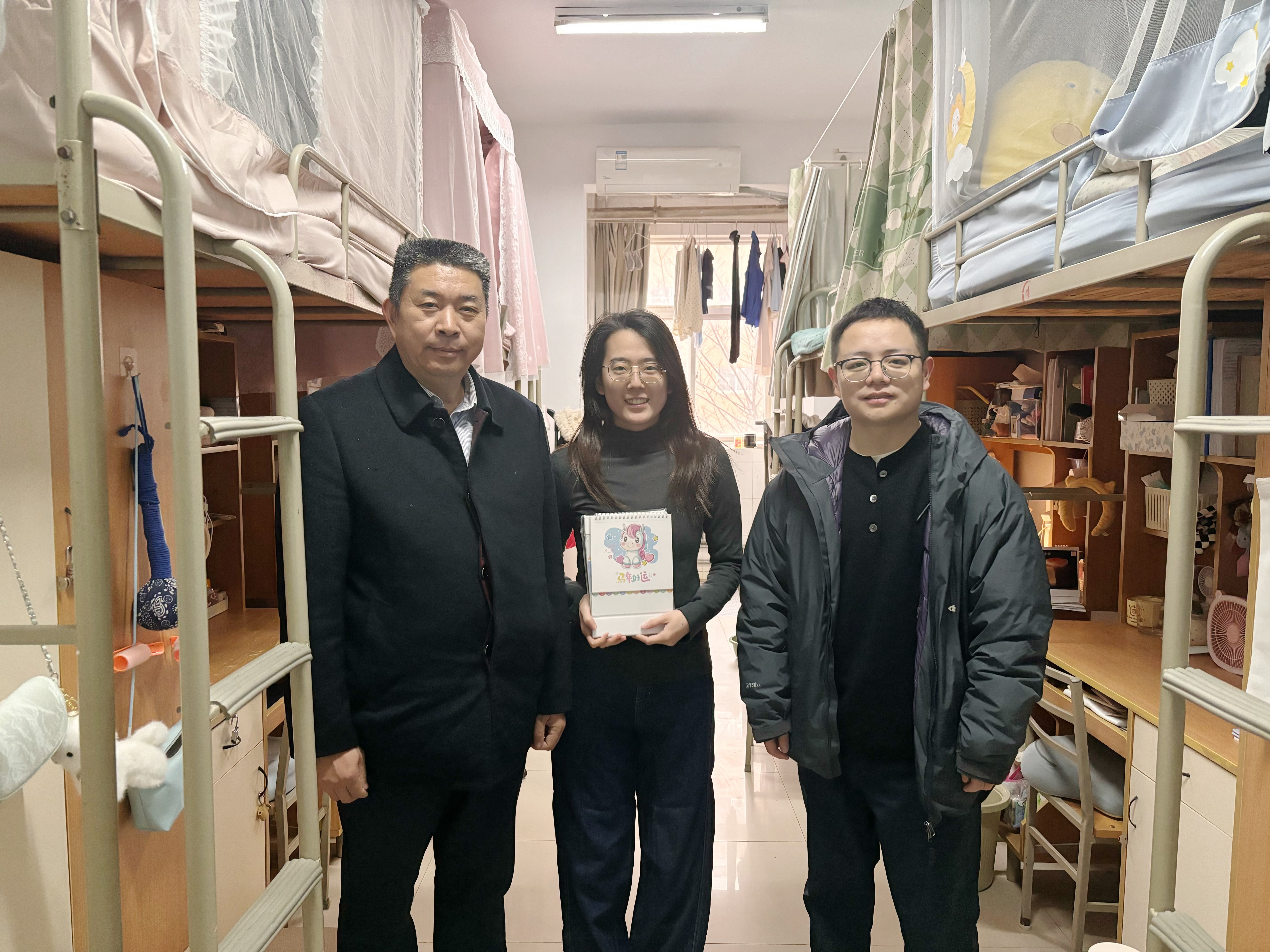走访过程中,学院领导们向同学们致以新年祝福,送上新年礼物,并与大家亲切交谈,详细了解同学们的学习科研进展和日常生活情况,认真倾听大家在课程学习、科研安排及生活保障等方面的意见建议。其间,恰逢两位同学生日,老师们为其送上了生日蛋糕和真挚祝福,在新年将至之际为同学们增添了一份温暖与惊喜,宿舍内洋溢着温馨而愉快的节日氛围。